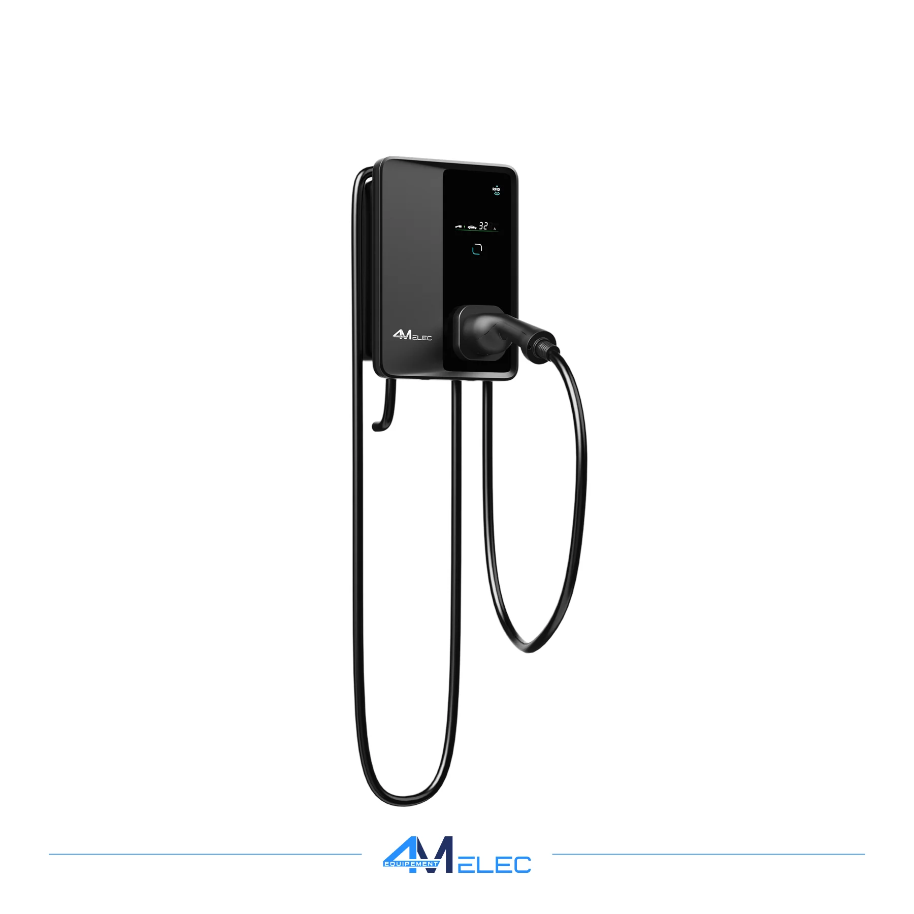 Borne murale triphasée de recharge pour voiture électrique, puissance 22 kW, câble Type 2 de 5 m, réglage du courant 8 à 32A, contrôle RFID, protections complètes et écran LCD.